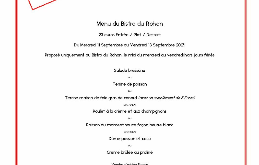 Actualités :  Les réservations pour les Menus des Fêtes de Fin d'Année sont ouvertes et se font uniquement via l'onglet "Menu des Fêtes-Boutique en Ligne" ou directement sur place à l'Auberge du Rohan.