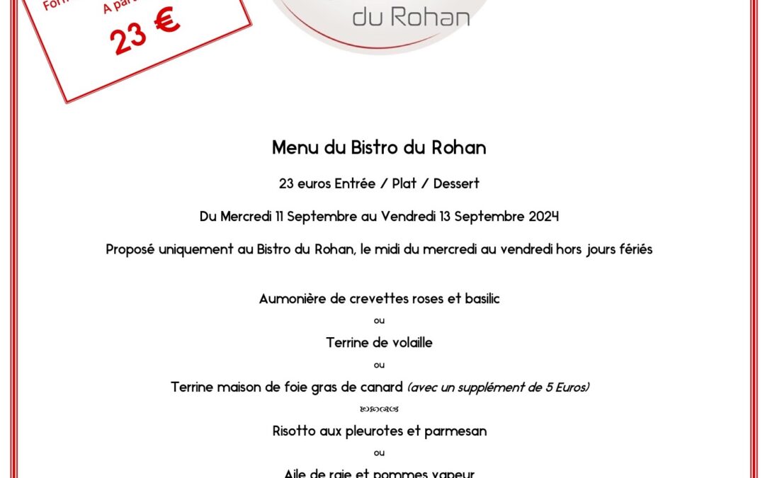 Actualités :  Les réservations pour les Menus des Fêtes de Fin d'Année sont ouvertes et se font uniquement via l'onglet "Menu des Fêtes-Boutique en Ligne" ou directement sur place à l'Auberge du Rohan.