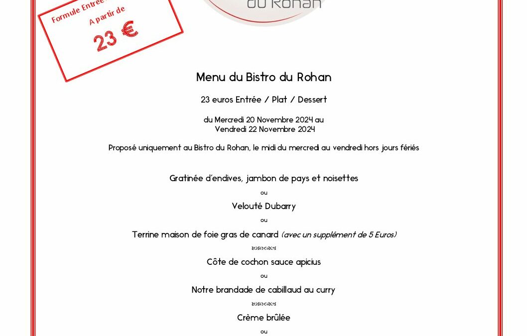 Actualités :  Les réservations pour les Menus des Fêtes de Fin d'Année sont ouvertes et se font uniquement via l'onglet "Menu des Fêtes-Boutique en Ligne" ou directement sur place à l'Auberge du Rohan.