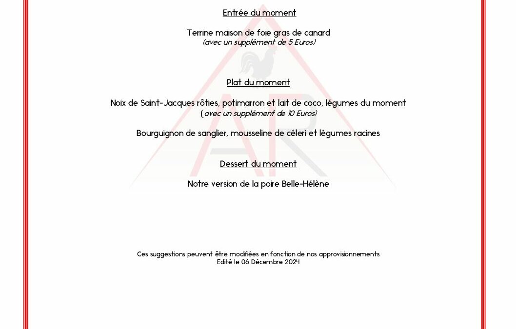 Les réservations pour les Menus des Fêtes de Fin d'Année sont ouvertes et se font uniquement via l'onglet "Menu des Fêtes-Boutique en Ligne" ou directement sur place à l'Auberge du Rohan.
