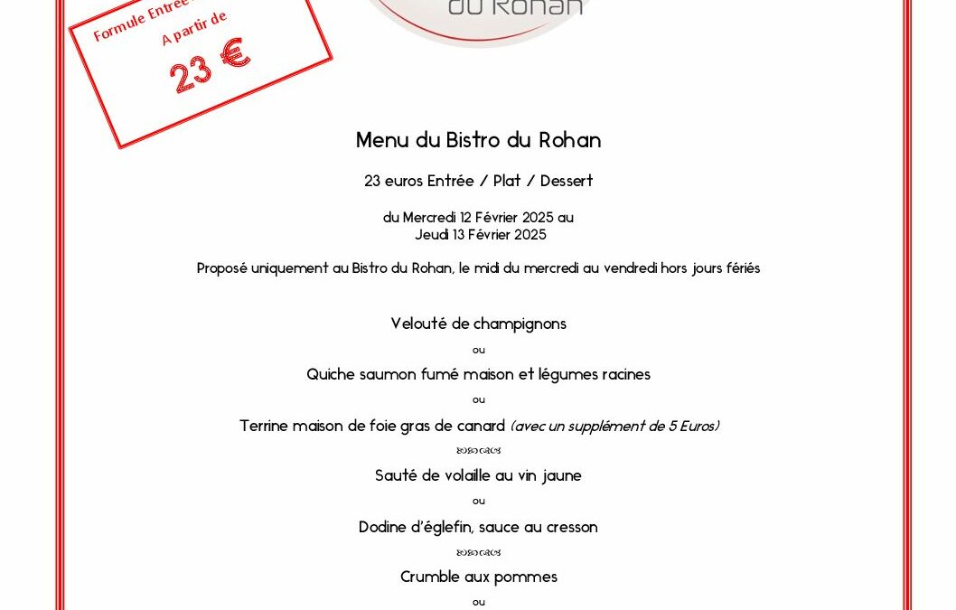Actualités :  Les réservations pour les Menus des Fêtes de Fin d'Année sont ouvertes et se font uniquement via l'onglet "Menu des Fêtes-Boutique en Ligne" ou directement sur place à l'Auberge du Rohan.