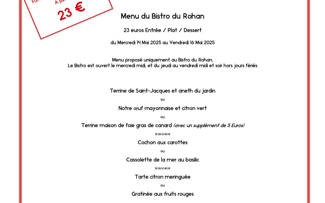 Actualités :  Les réservations pour les Menus des Fêtes de Fin d'Année sont ouvertes et se font uniquement via l'onglet "Menu des Fêtes-Boutique en Ligne" ou directement sur place à l'Auberge du Rohan.