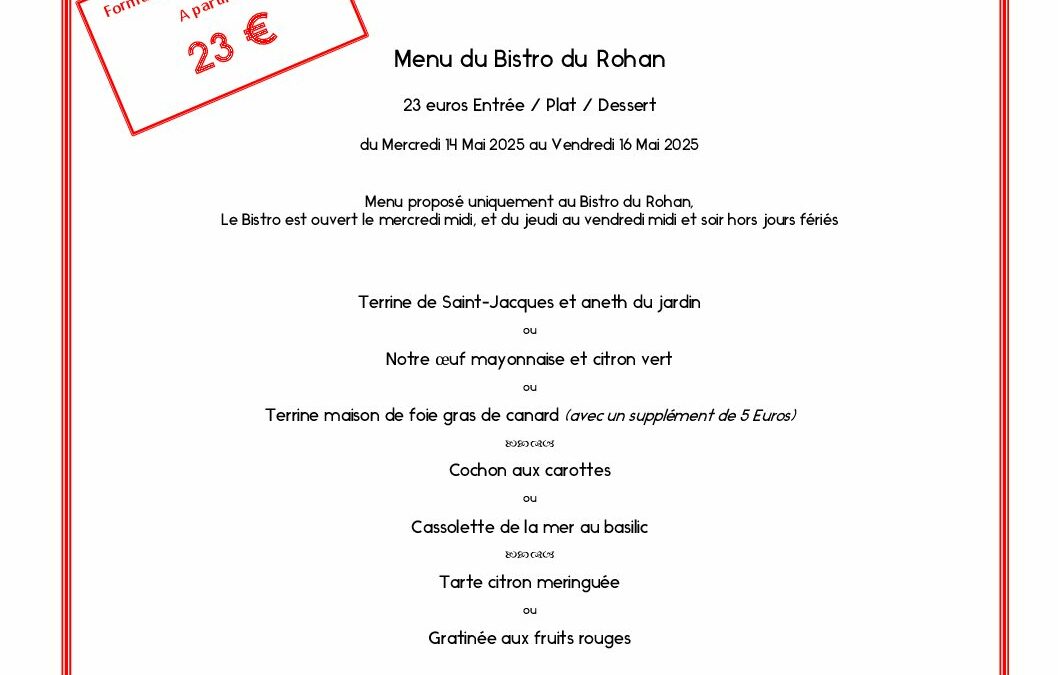Actualités :  Les réservations pour les Menus des Fêtes de Fin d'Année sont ouvertes et se font uniquement via l'onglet "Menu des Fêtes-Boutique en Ligne" ou directement sur place à l'Auberge du Rohan.