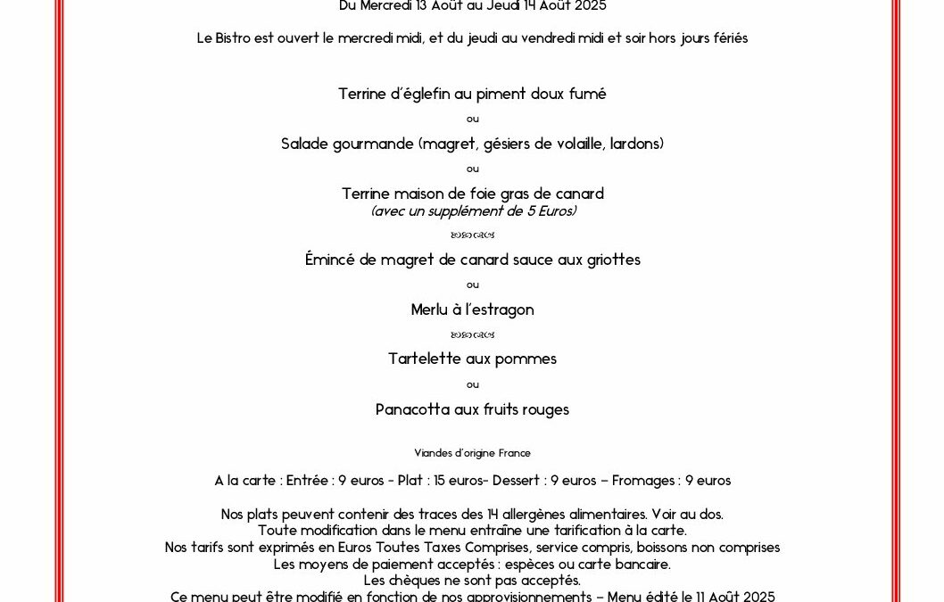 Règlements acceptés : Carte Bleue ou espèces. Les chèques ne sont pas acceptés.