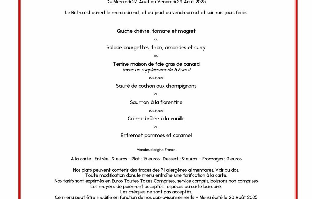 Règlements acceptés : Carte Bleue ou espèces. Les chèques ne sont pas acceptés.
