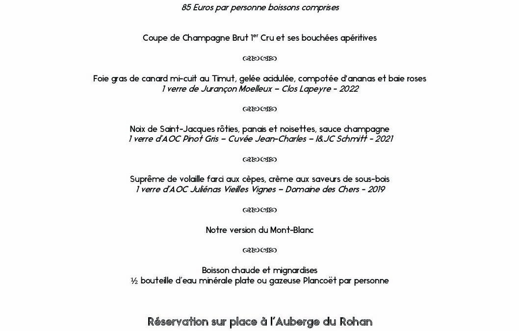 Actualités :  Les réservations pour les Menus des Fêtes de Fin d'Année sont ouvertes et se font uniquement via l'onglet "Menu des Fêtes-Boutique en Ligne" ou directement sur place à l'Auberge du Rohan.