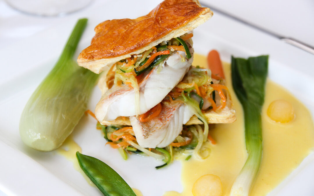 Plat : feuilleté de rascasse, julienne de légumes, beurre blanc à l’orange